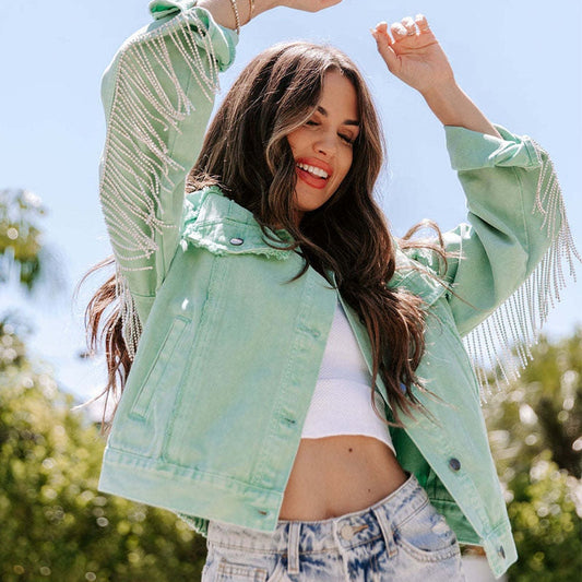 Damjacka LĂ„nga Ărmar Fransar Denim för Damer