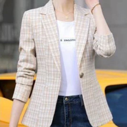 Dam Blazer Klassisk Stil med Rutiga Axeldetaljer i Högkvalitativt Tyg