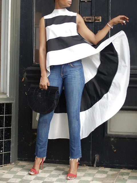 Dam Blus Randig Hög Hals Polyester Löst Snitt
