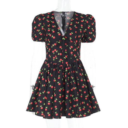Damklänning Figurbetonad med Körsbärsmönster och Elastiska Puffärmar
