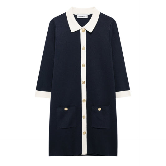 Dam Skjortklänning A-Line med Elegant Krage och Praktiska Väskor, 3/4 Ärmar, Andningsbart Material