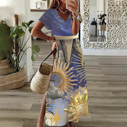 Dam Sommarklänning Blommönster Hög Midja V-ringning 100% Bomull