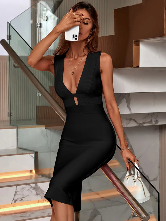 Dam Midi Klänning V-ringad Figurnära Polyester Spandex