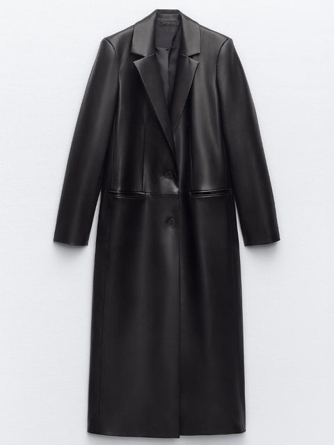 Kvinnors Lång Jacka Syntetiskt Läder Med Vikbar Krage