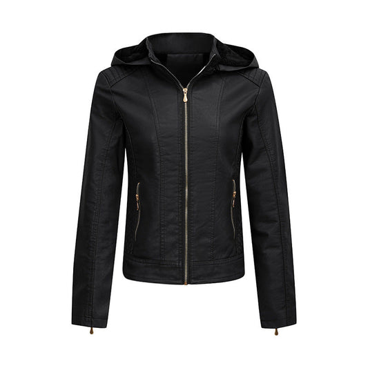 Dam Läderjacka Termisk Foder Rund Halsringning Justerbar Huva PU-Läder