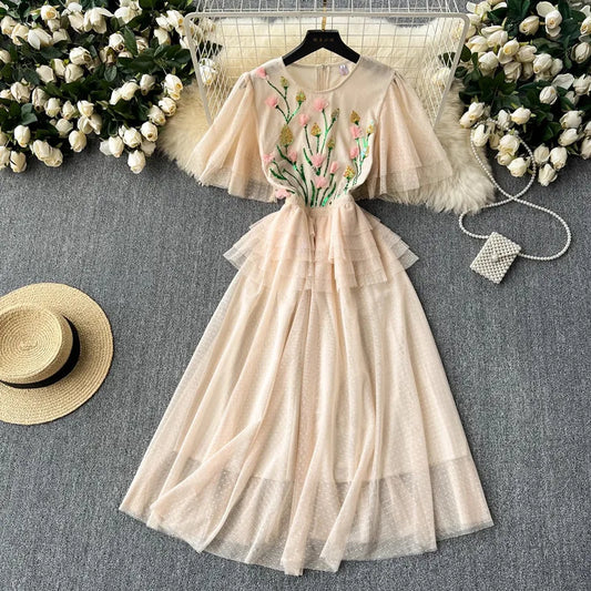Dam Midi Klänning Smockad med Kapärmar i Bomull och Polyester