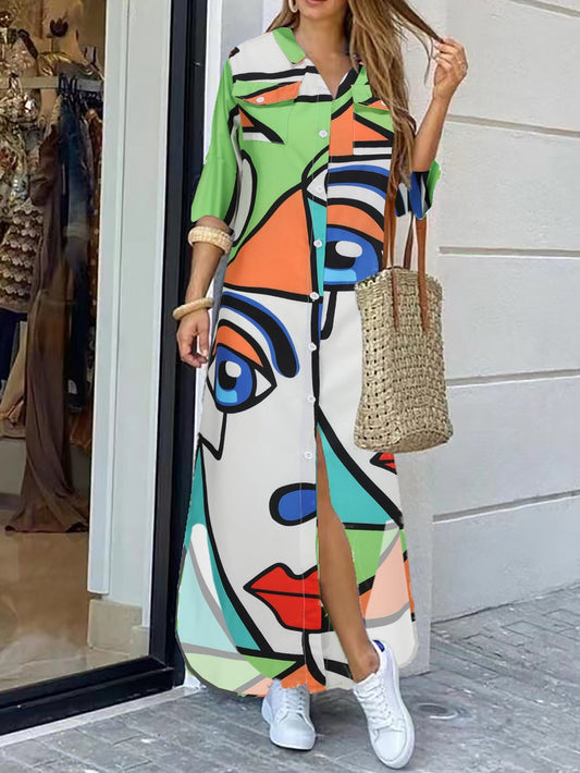 Dam Klänning Lång Ärmskjorta Mönstrad Polyester Loose Fit