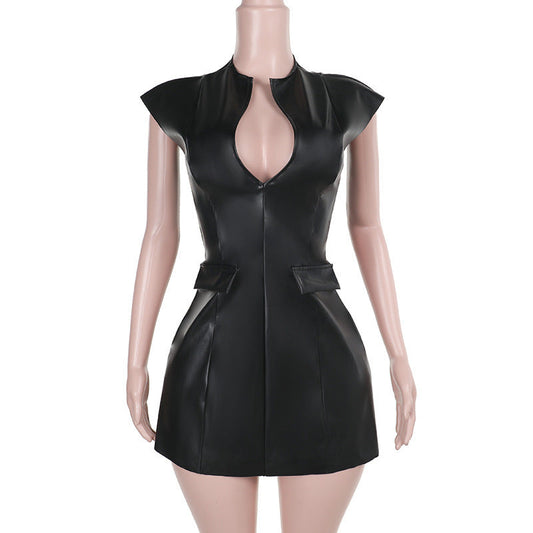Kvinnors Svart Miniklänning Djup V-ringning Syntetiskt Läder
