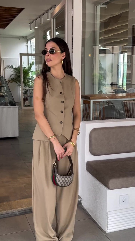 Kostym Set Dam Ärmlös V-hals Top Vidskuren Byxor Lätt Vävsmaterial