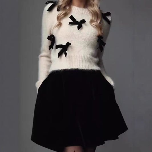 Stickad Dam Tröja med Dekorativa Satinslingor i Mjuk Tyg