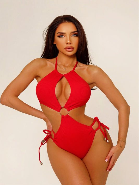 Dam Bikiniuppsättning med Utskärningar och Kedjeaccenter Mjukt Elastiskt Tyg