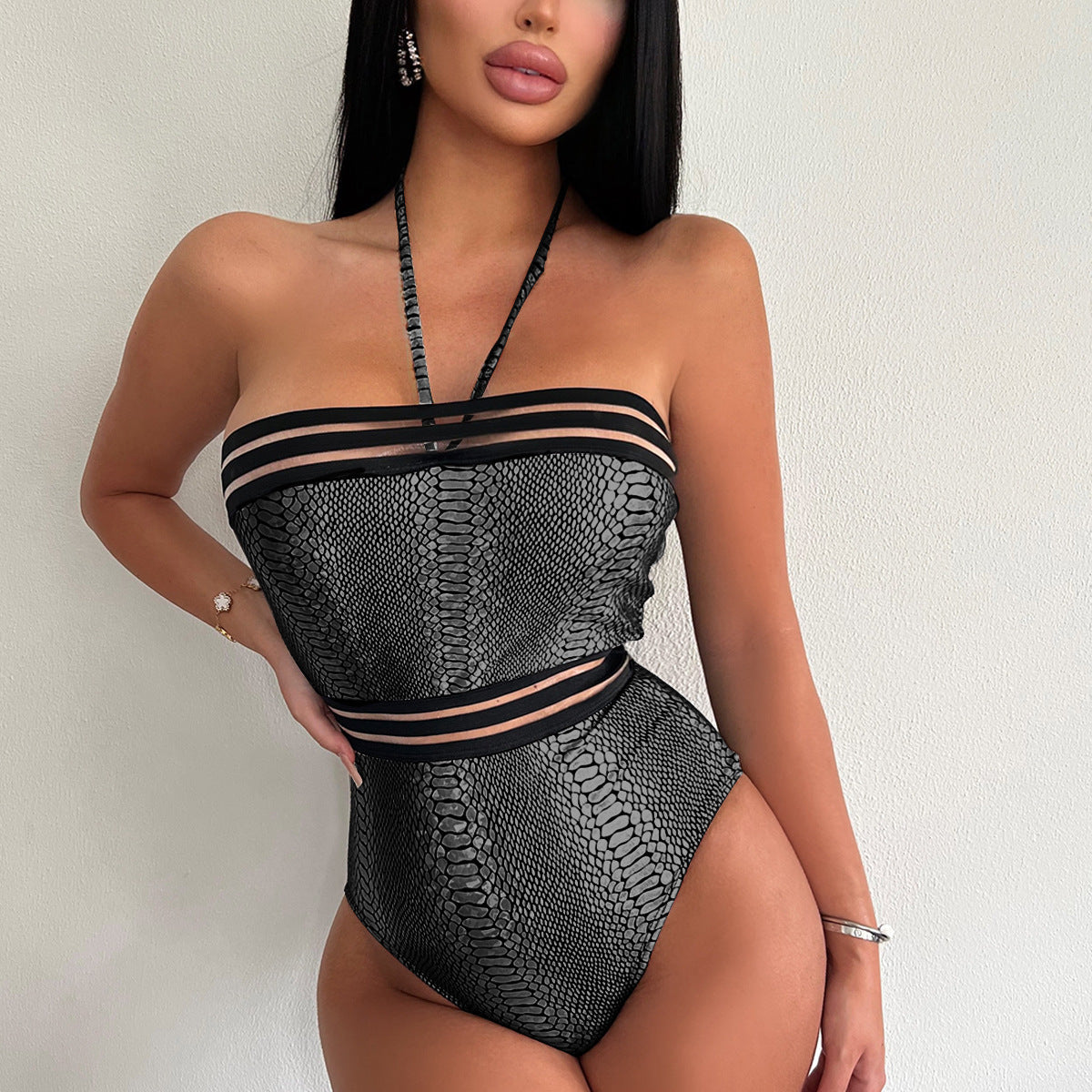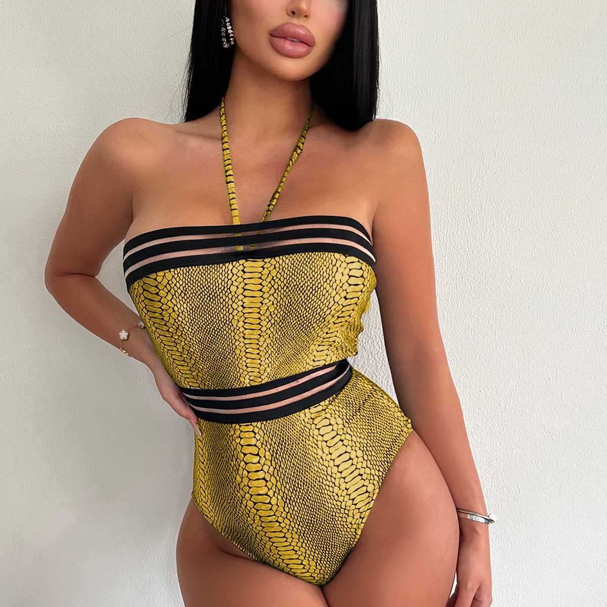 Baddräkten har ett modernt ormlädermönster och höga benstycken som framhäver din silhuett. Det osynliga stödet runt toppen säkerställer att allt sitter på plats, oavsett om du simmar eller kopplar av på stranden.