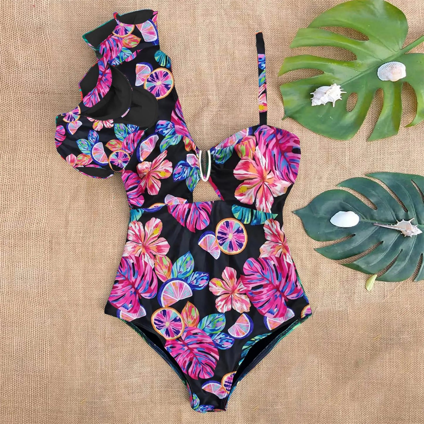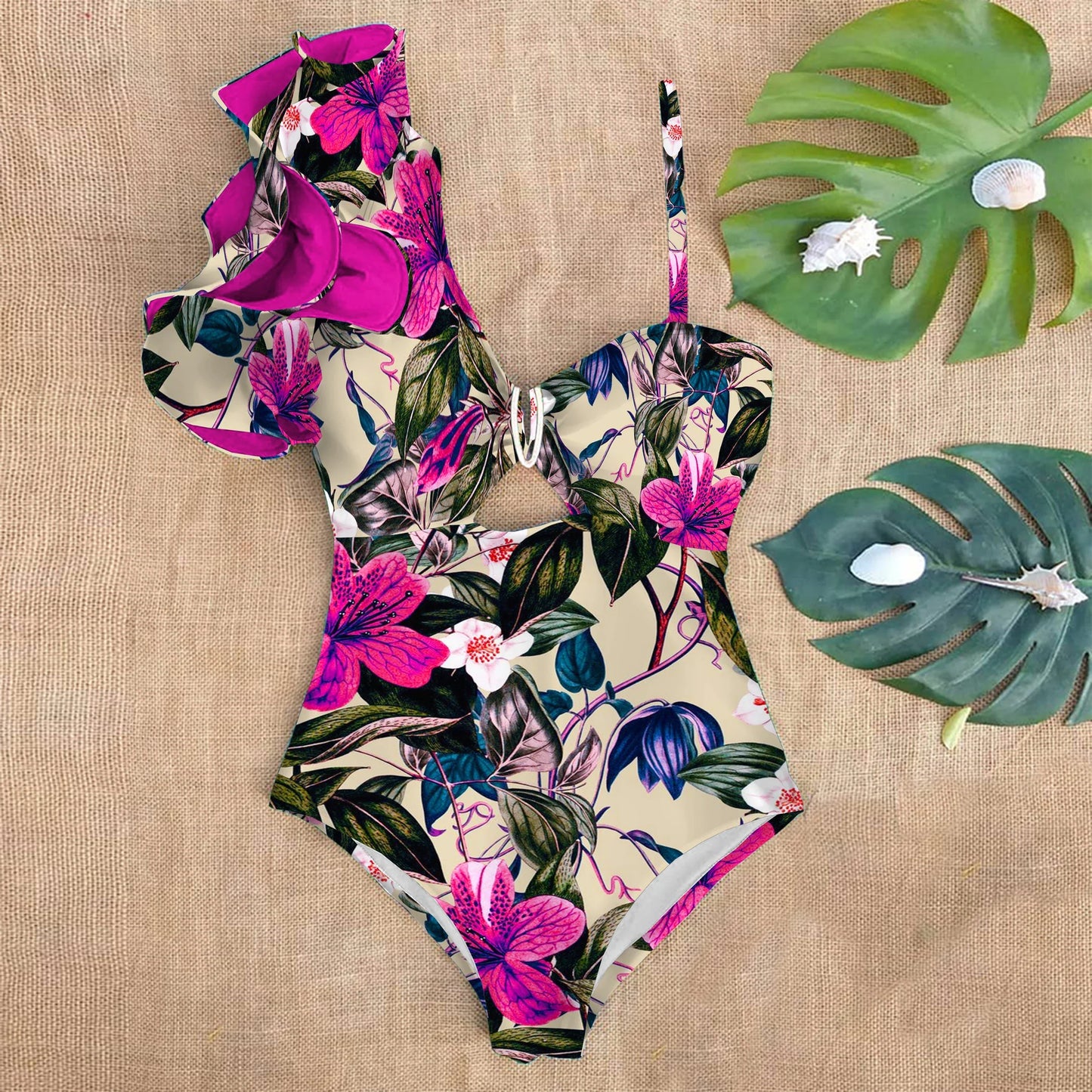 Denna baddräkt kombinerar eleganta designinslag med funktionalitet, vilket gör den perfekt för både avkoppling vid poolen och aktiva dagar på stranden. Med sitt blommönster och ruffles får du en feminin och lekfull look.