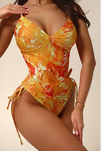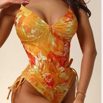 Med ett feminint blommönster och en smickrande V-ringning, är denna baddräkt både elegant och funktionell. Justerbara snörningar på sidorna ger dig möjlighet att anpassa passformen och benskärningen efter eget önskemål, vilket gör den idealisk för alla kroppstyper.
