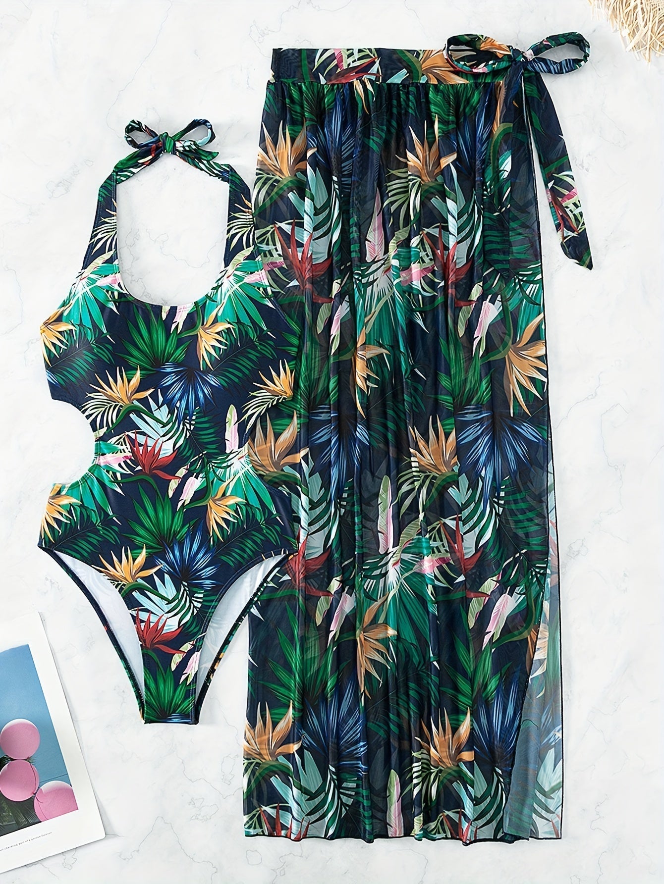 Den flexibla sarongen, prydd med ett vackert blommönster, kompletterar looken och gör att du kan njuta av varje ögonblick vid vattnet. Uppsättningen är tillverkad av en lyxig blandning av polyester och elastan, vilket ger både komfort och rörelsefrihet.