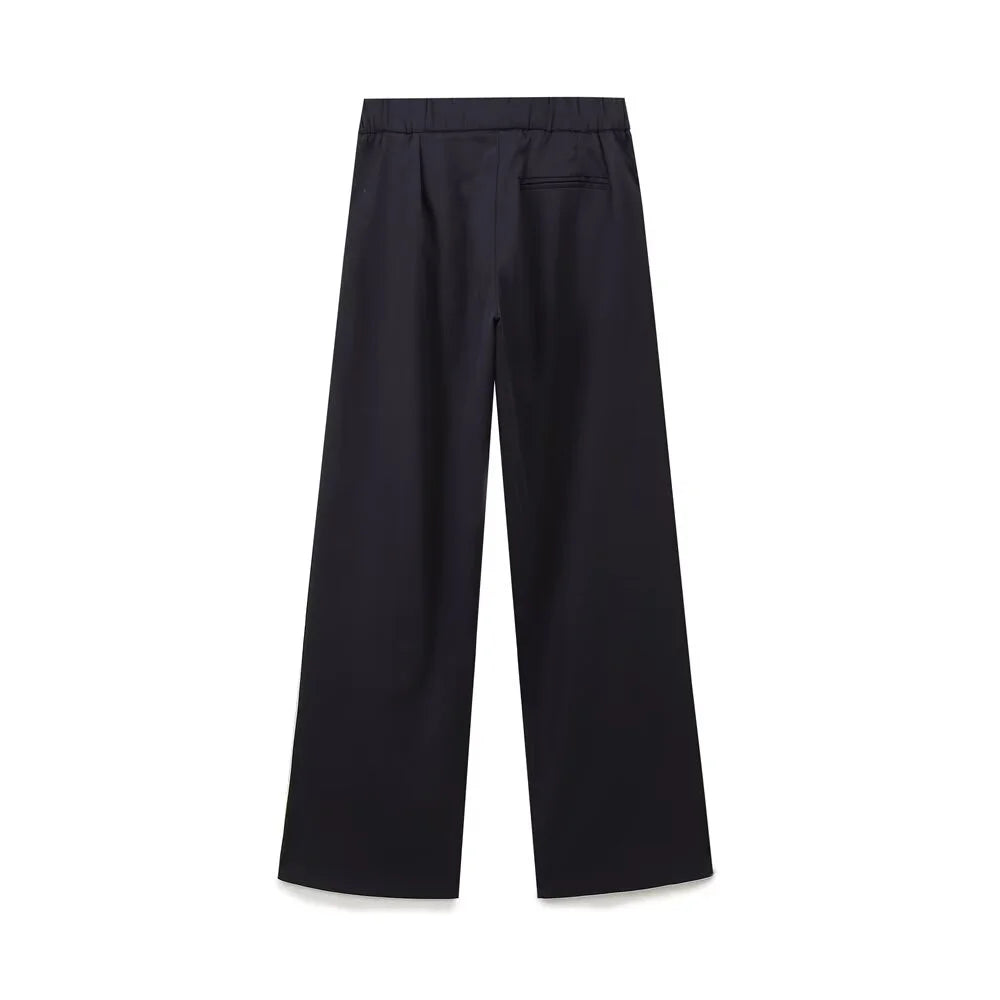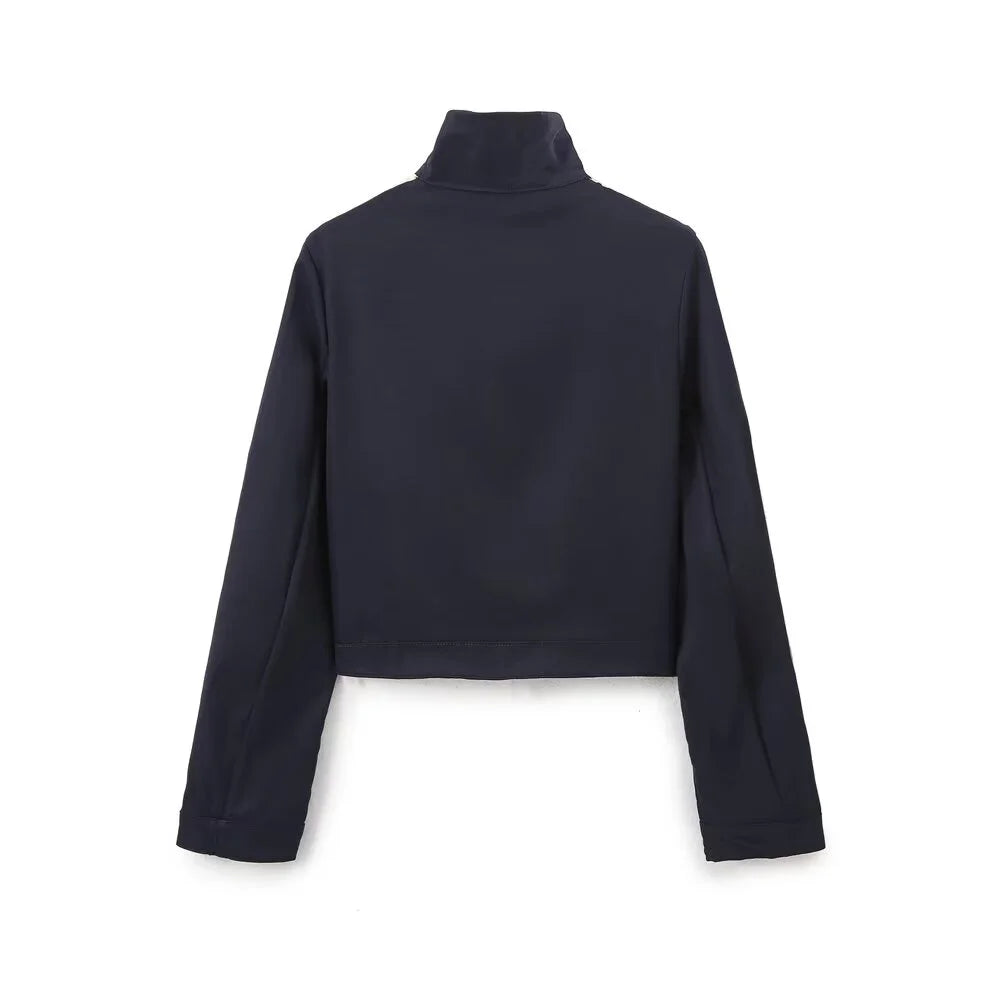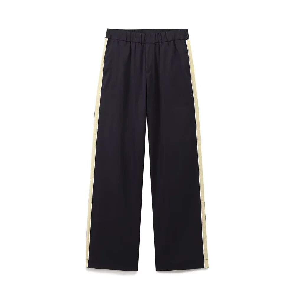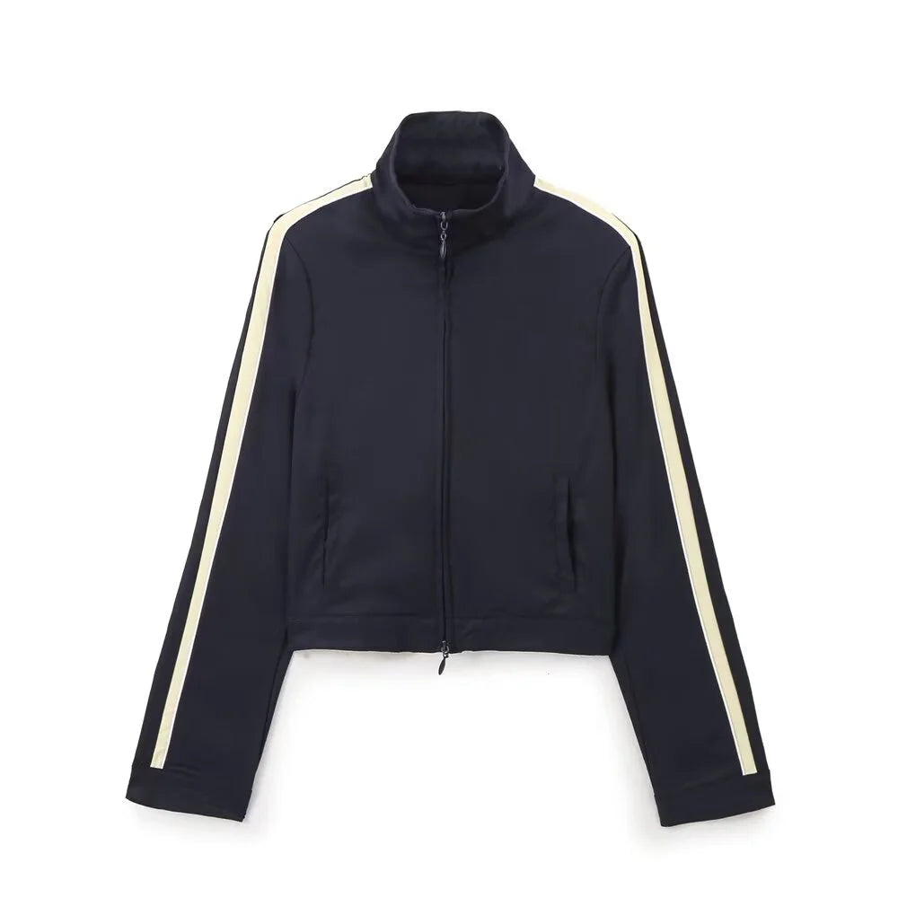 Uppsättningen består av välskurna byxor och en tröja med zip, vilket gör den idealisk för både träning och vardagliga aktiviteter. Den klassiska marinblå färgen med kontrasterande ränder ger en sportig och elegant look som passar alla tillfällen.