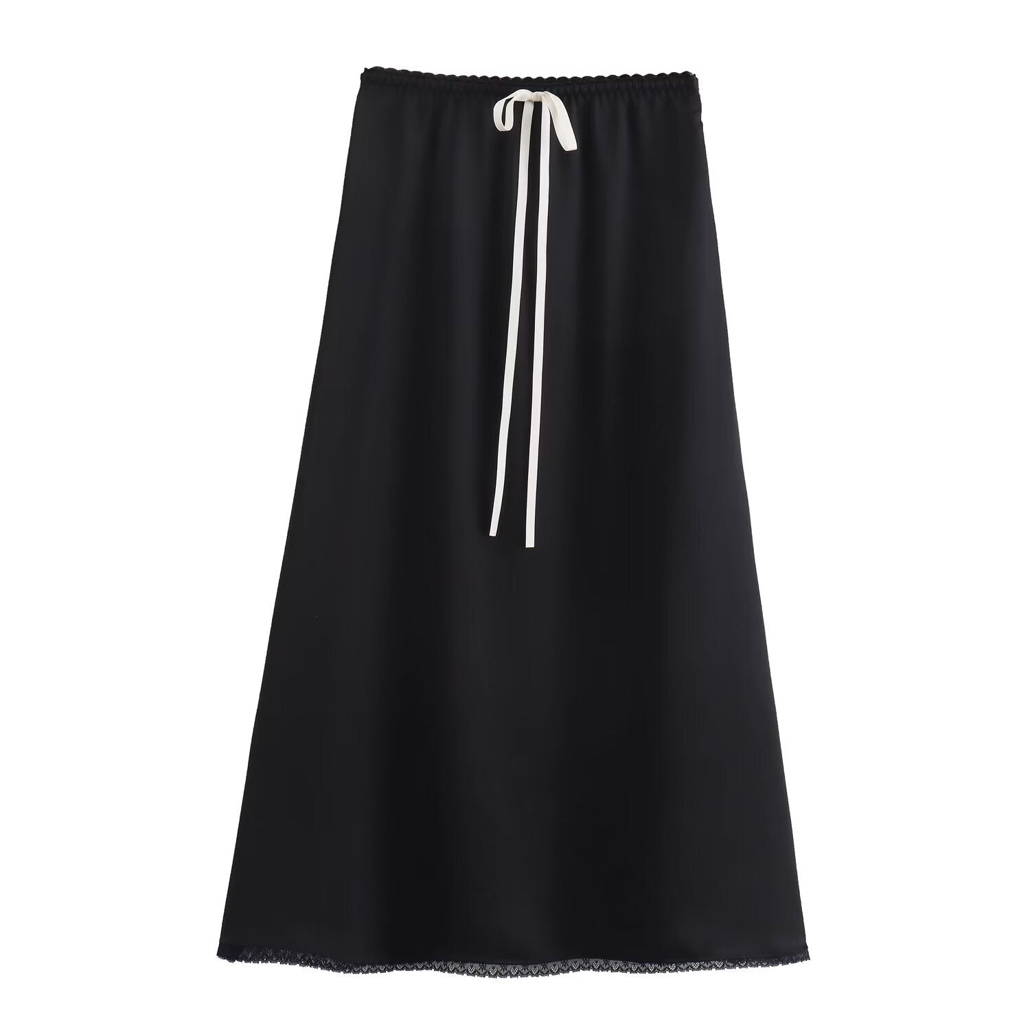 Kjolen har en klassisk A-Line silhuett som smickrar alla kroppstyper. Den är tillverkad av mjukt satinmaterial med spetsdetaljer som ger en unik och feminin känsla. Perfekt för både vardag och festliga tillfällen.