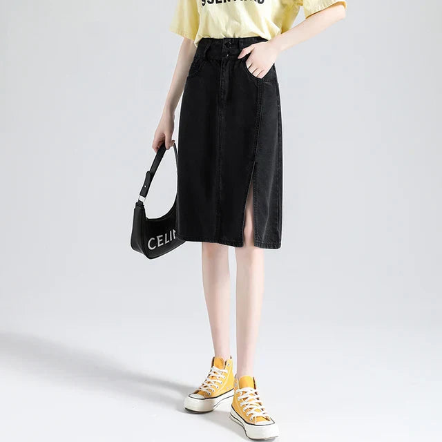 Denna denimkjol med hög midja är både stilren och bekväm, perfekt för att skapa en smickrande silhuett. Känn dig självsäker och elegant oavsett tillfälle.