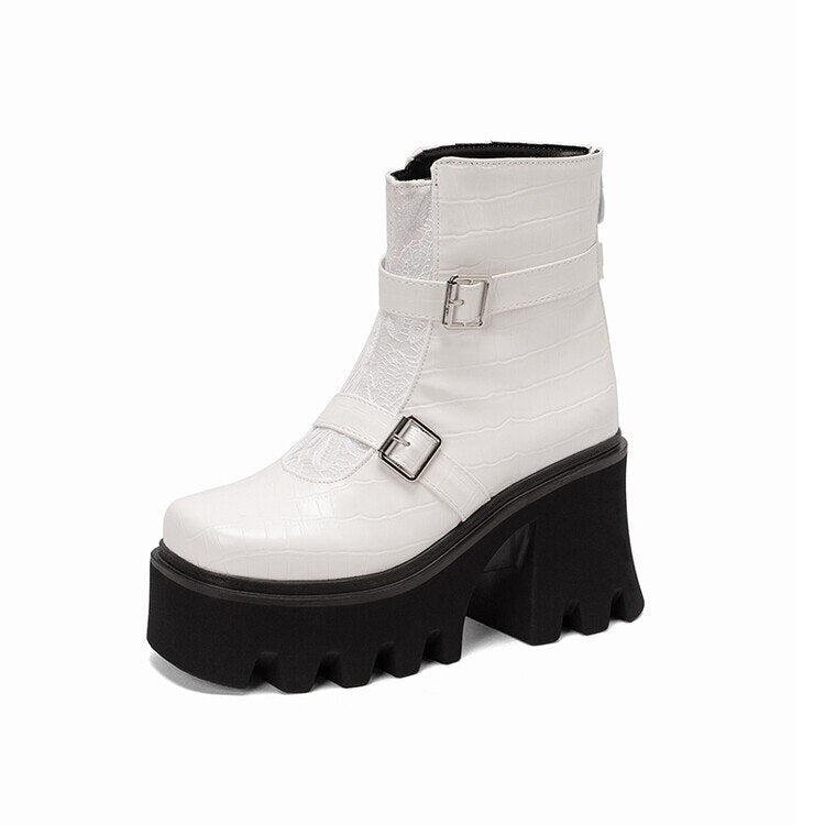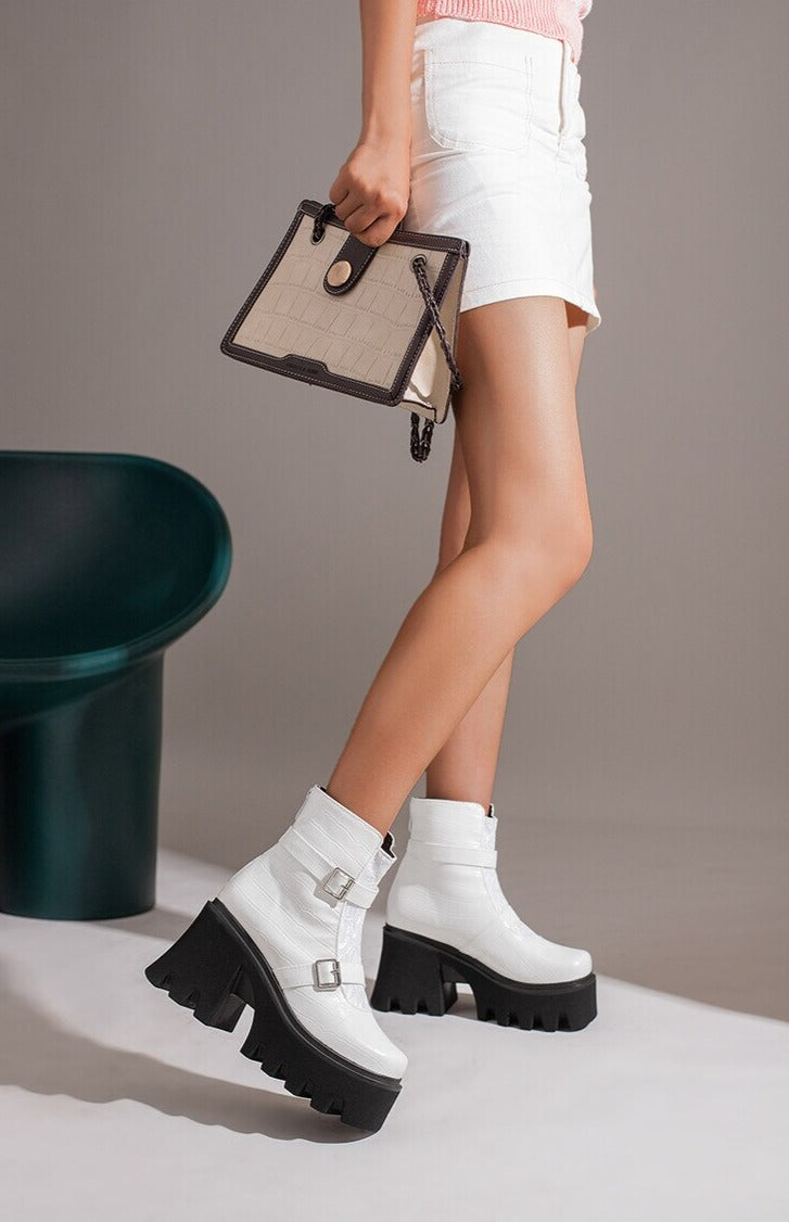 Stövlarna har en rund tåform och en plattformsula som ger en modern look. Det dekorativa spännet och dragkedjan gör dem både praktiska och eleganta, vilket gör dem lämpliga för både vardag och fest.