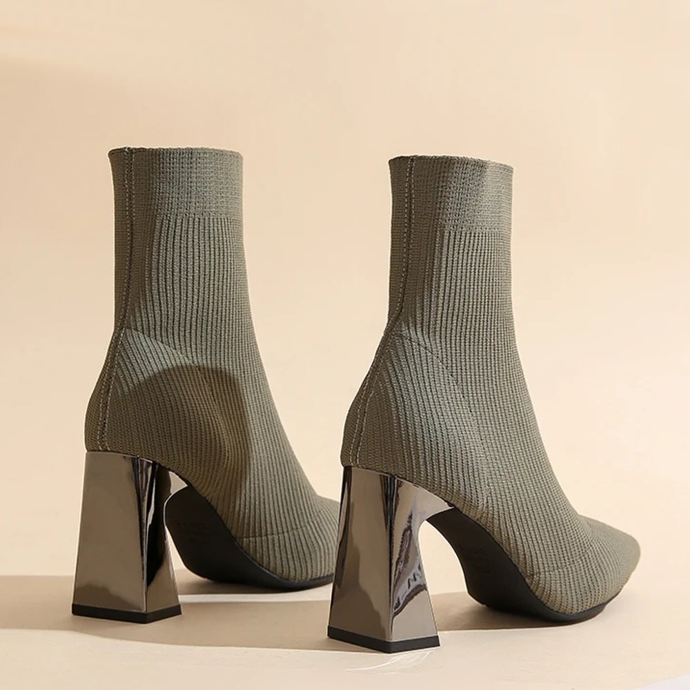 Med en spetsig silhuett och en 8 cm hög, kvadratisk klack, är dessa ankelstövlar både trendiga och funktionella. Det flexibla, stickade övre materialet ger en bekväm passform, vilket gör dem perfekta för både vardag och festliga tillfällen.
