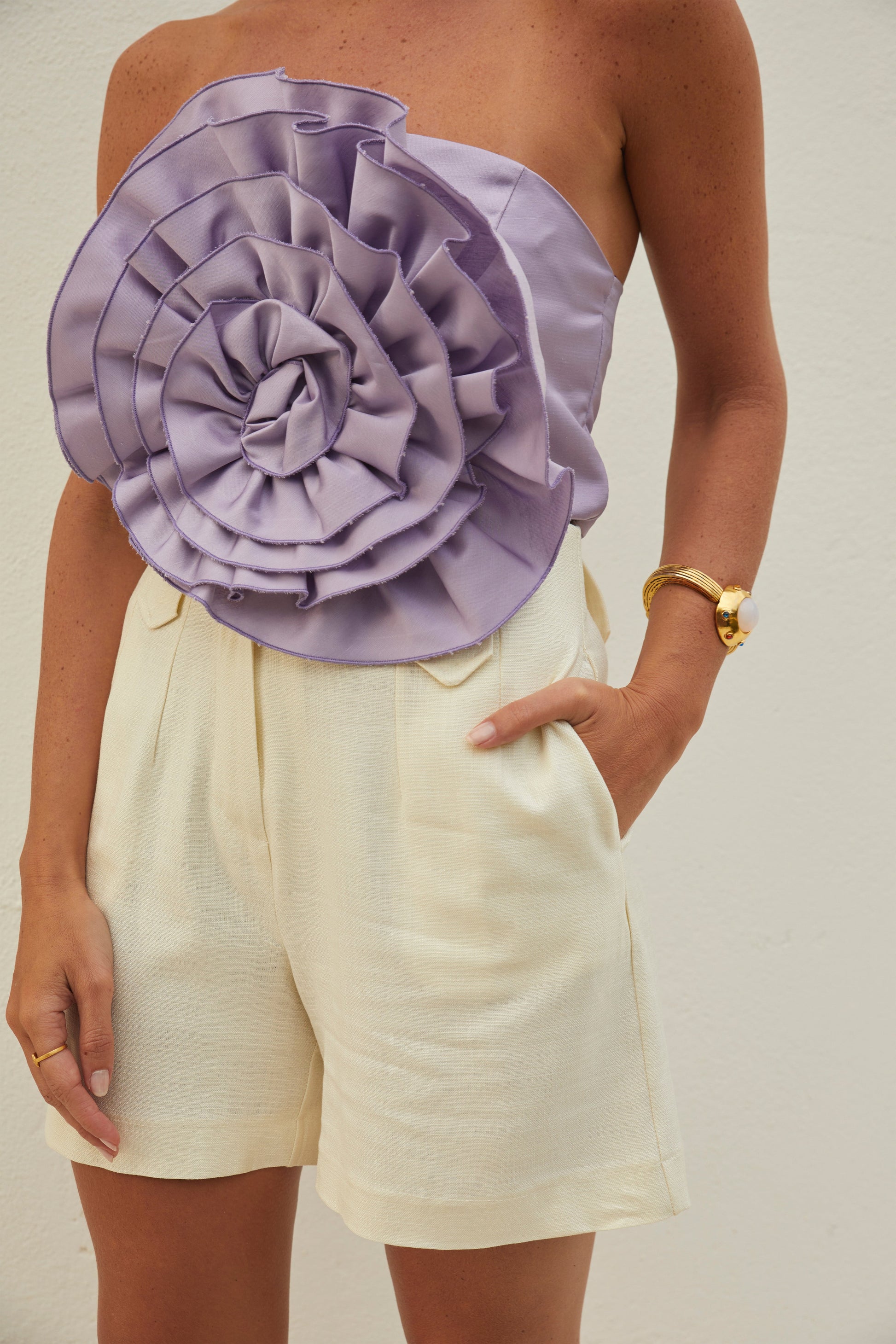 Vår Wolff Top är en konkurrenskraftig bandeau-topp med en fantastisk, veckad rosdetalj som ger en skulptural känsla. Den är idealisk att kombinera med våra BEA-byxor för en komplett look som verkligen sticker ut.