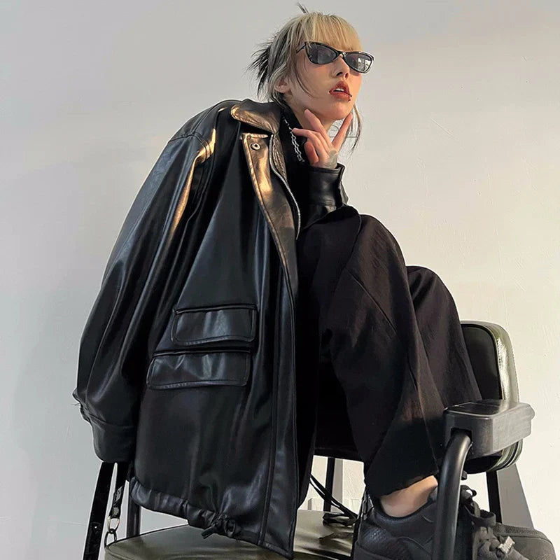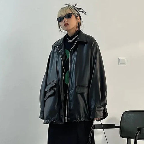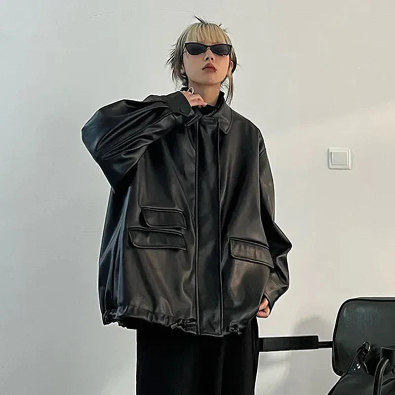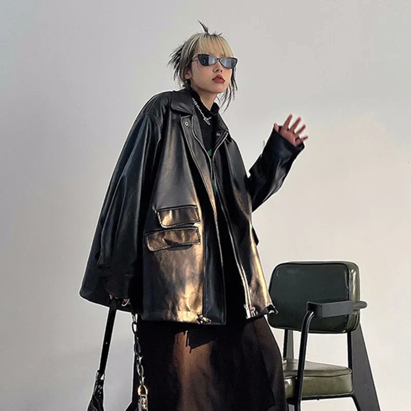 Dam Bikerjacka Överdimensionerad Läder med Blixtlås och Bred Krage