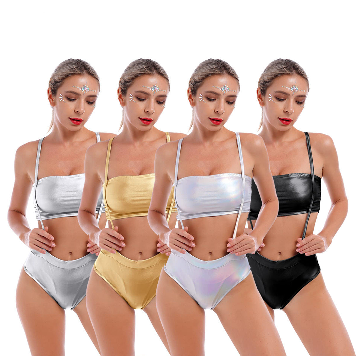 Uppsättningen består av en högskuren nedre del och en skimrande topp med justerbara remmar, vilket ger en smickrande silhuett och en anpassad passform. Den skimrande toppen fångar ljuset och ger en glamorös look, perfekt för soliga dagar.