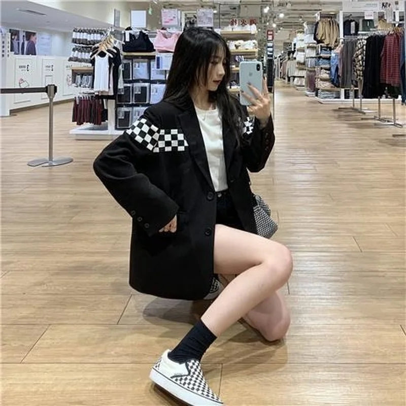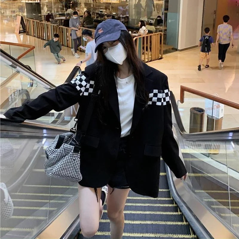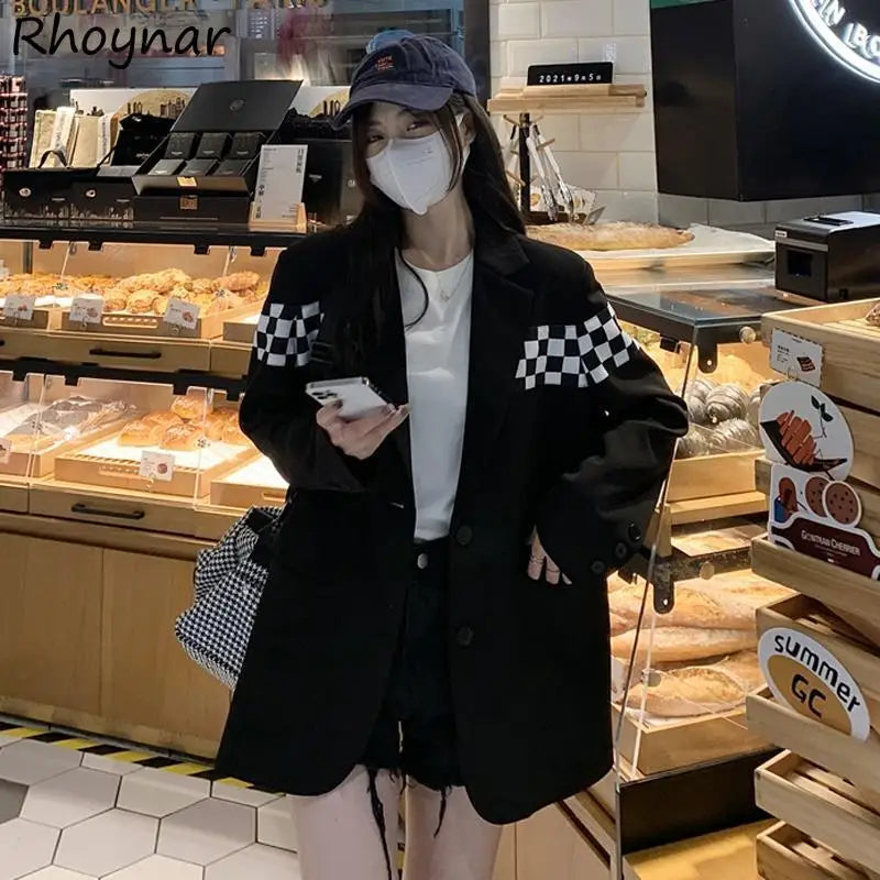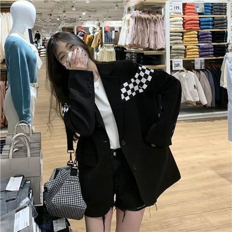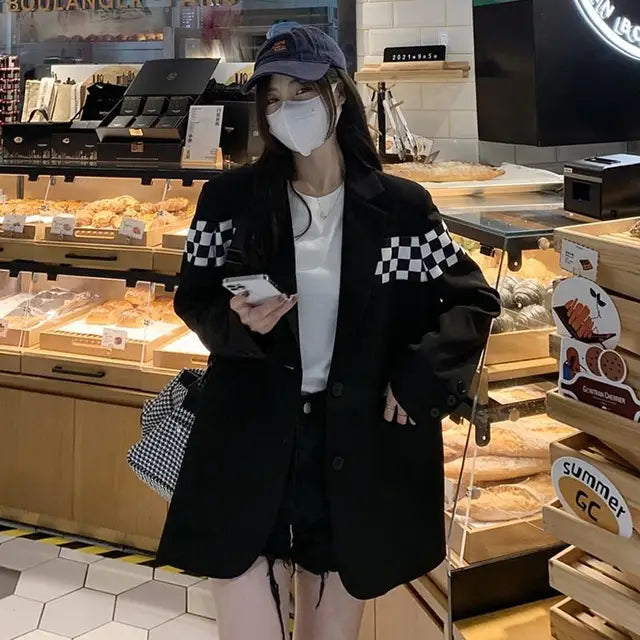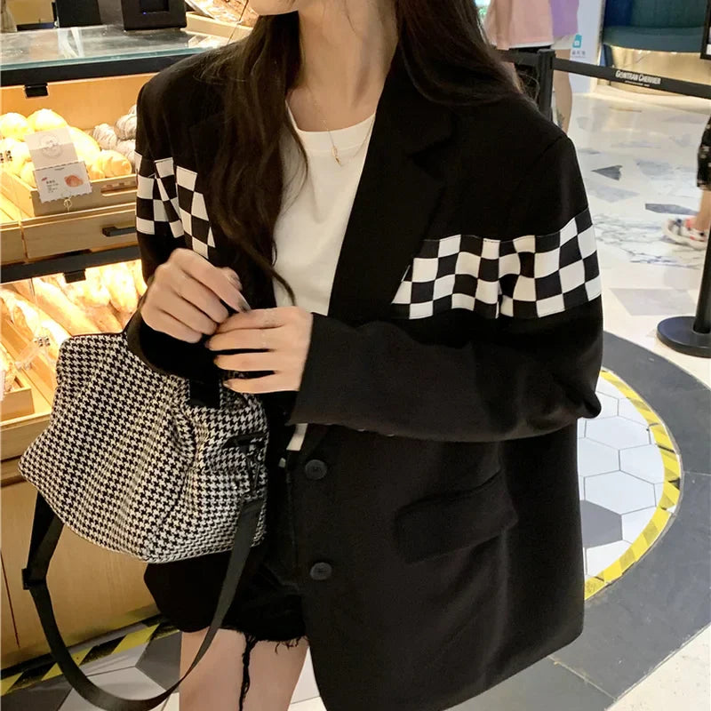 Dam Blazer Klassisk Stil med Rutiga Axeldetaljer i Högkvalitativt Tyg