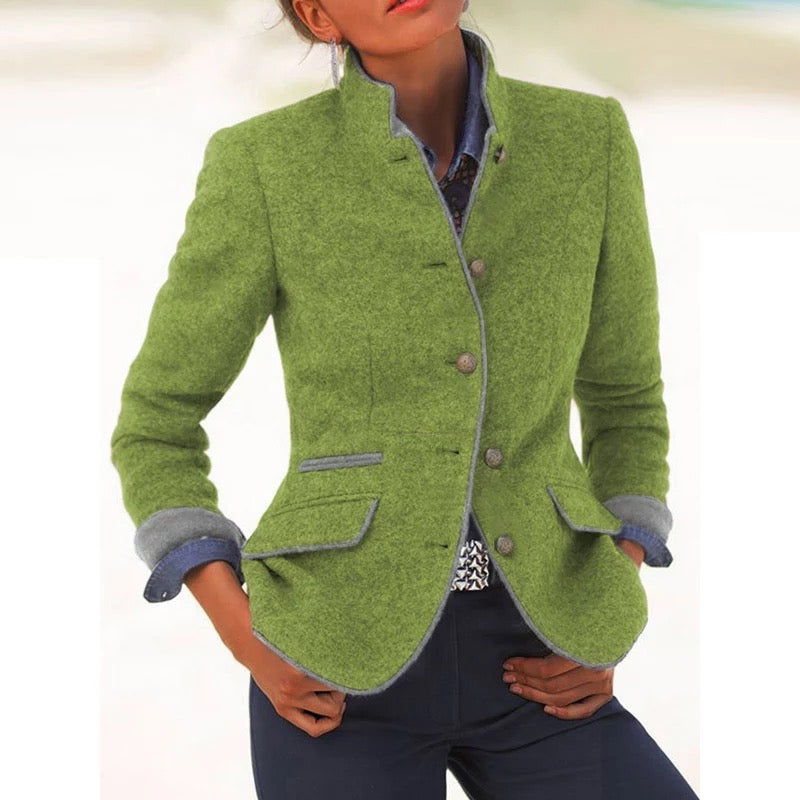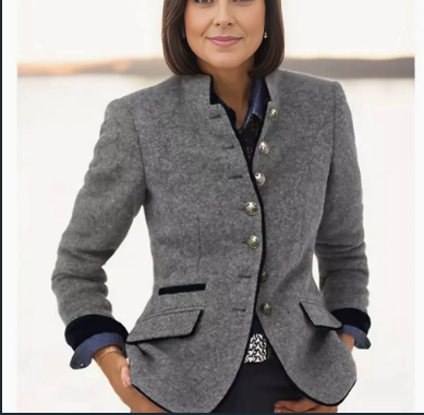 Blazern har en stilren stand-up-krage och är perfekt för både vardag och fest. De snygga detaljerna som höftfickorna och knappstängningen ger en sofistikerad touch, vilket gör den till ett måste för varje modeälskare.