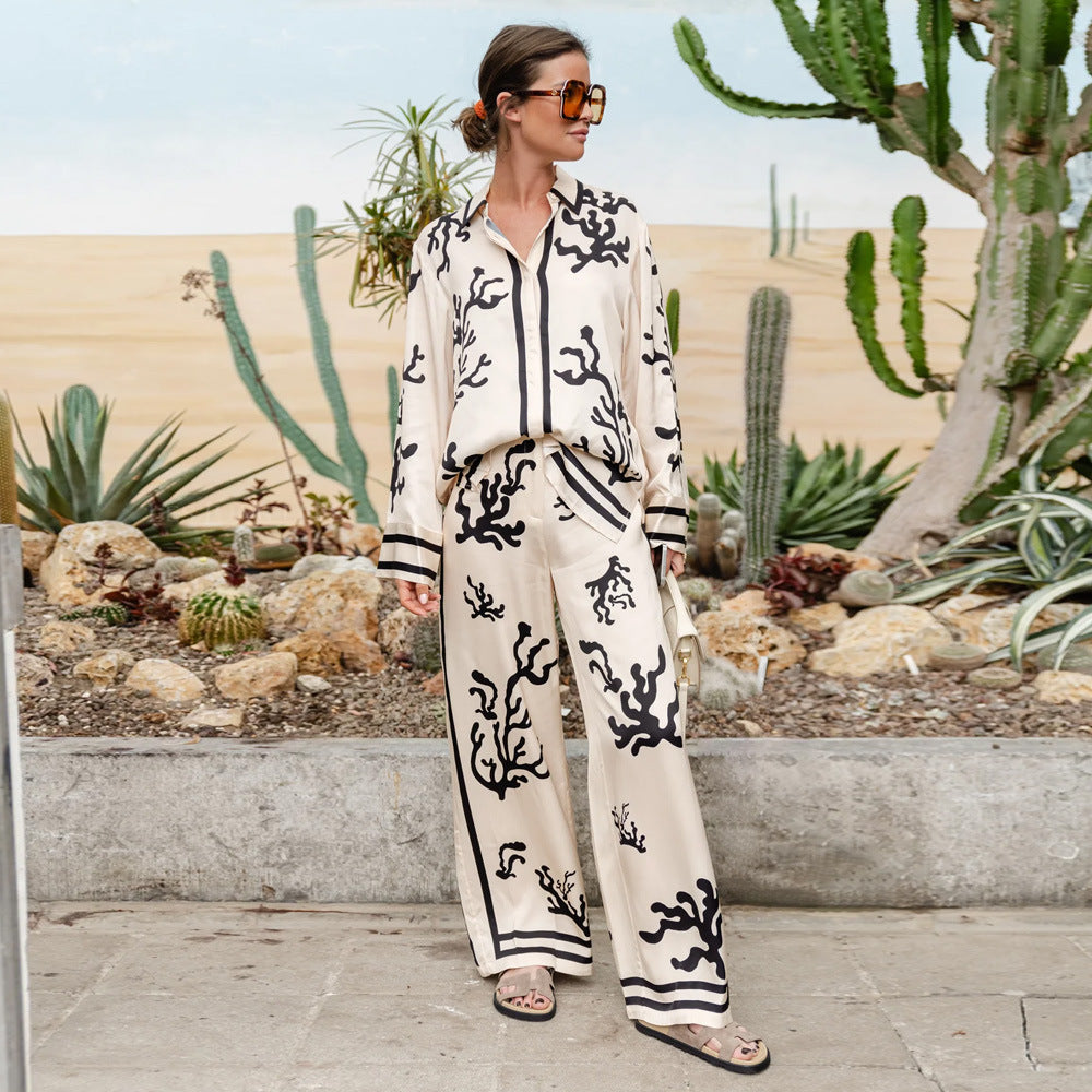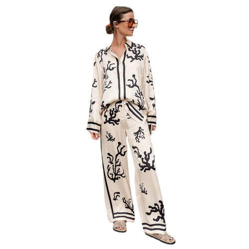 Dam Blommönstrad Långärmad Skjorta och Byxor i Mjuk Tyg för Sommar