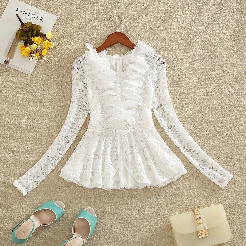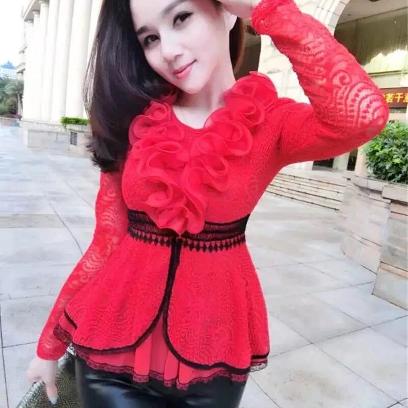 Dam Blus med Ruffles Andningsbar Bomull V-hals Långa Ärmar