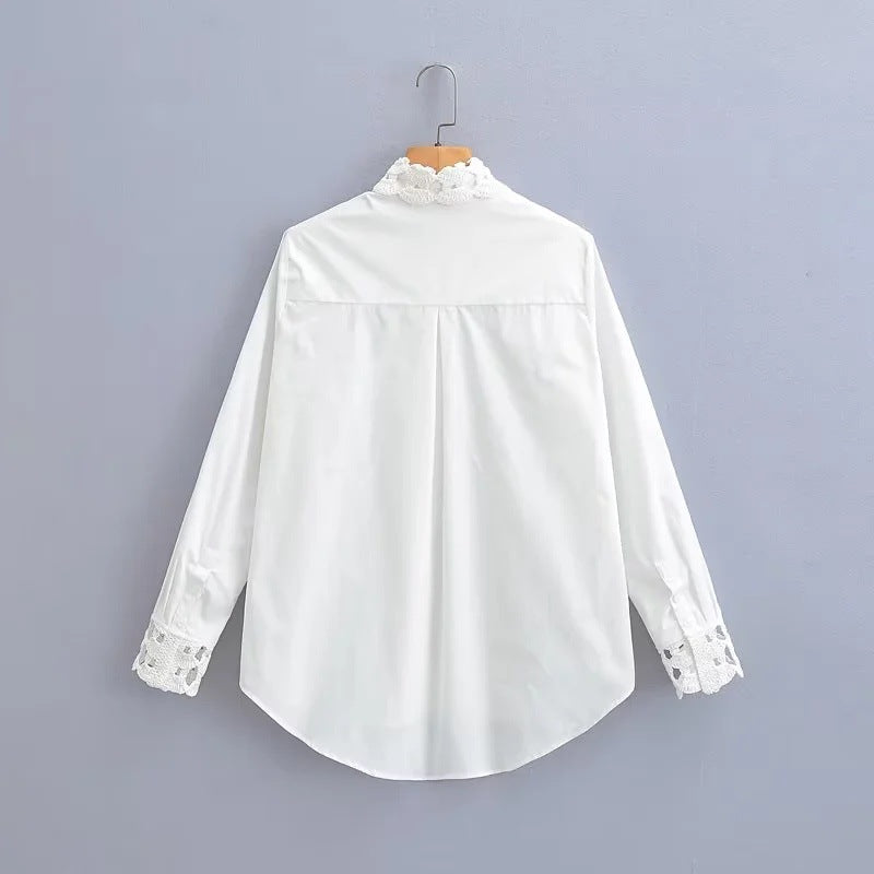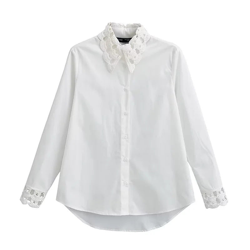 Dam Blus med Spetsdetaljer och Modern Krage i Bomull