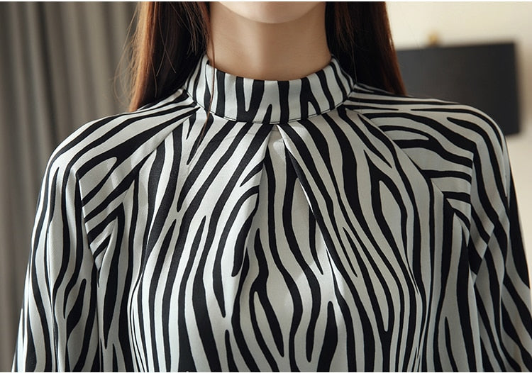 Blusen har en klassisk design med långa ärmar och en stående krage, vilket ger en tidlös look. Den lätta chiffongmaterialet gör den idealisk för varma dagar, samtidigt som den kan stylas för en mer formell tillställning.