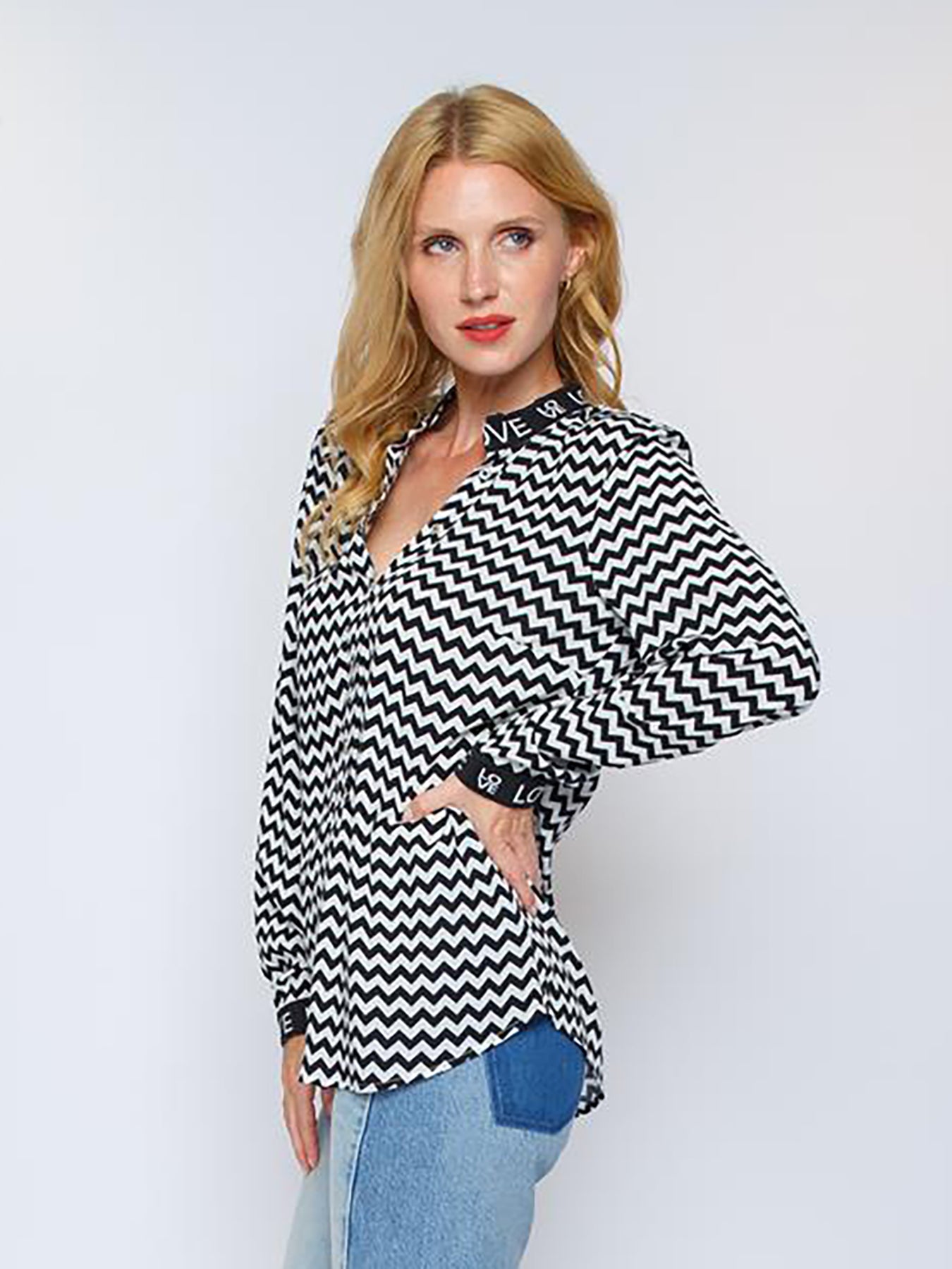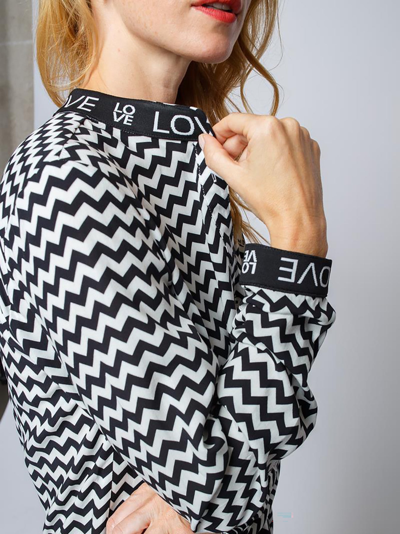 Blusen har ett iögonfallande sicksackmönster som ger en unik touch. Den lilla ståkragen och v-ringningen skapar en feminin silhuett, medan de långa ärmarna med smala manschetter ger en sofistikerad känsla. Den rundade nederkanten ger en avslappnad men stilfull look, perfekt för både vardag och fest.