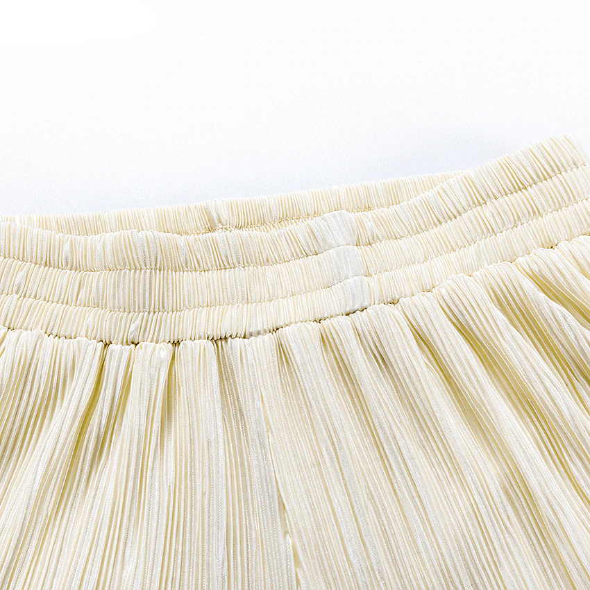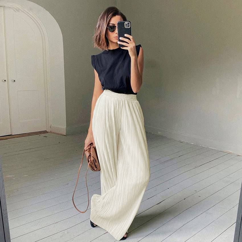 Dessa byxor har en modern design med vida ben och en elastisk midja, vilket gör dem både bekväma och stiliga. Den plisserade detaljen ger en unik touch som passar utmärkt för olika tillfällen.