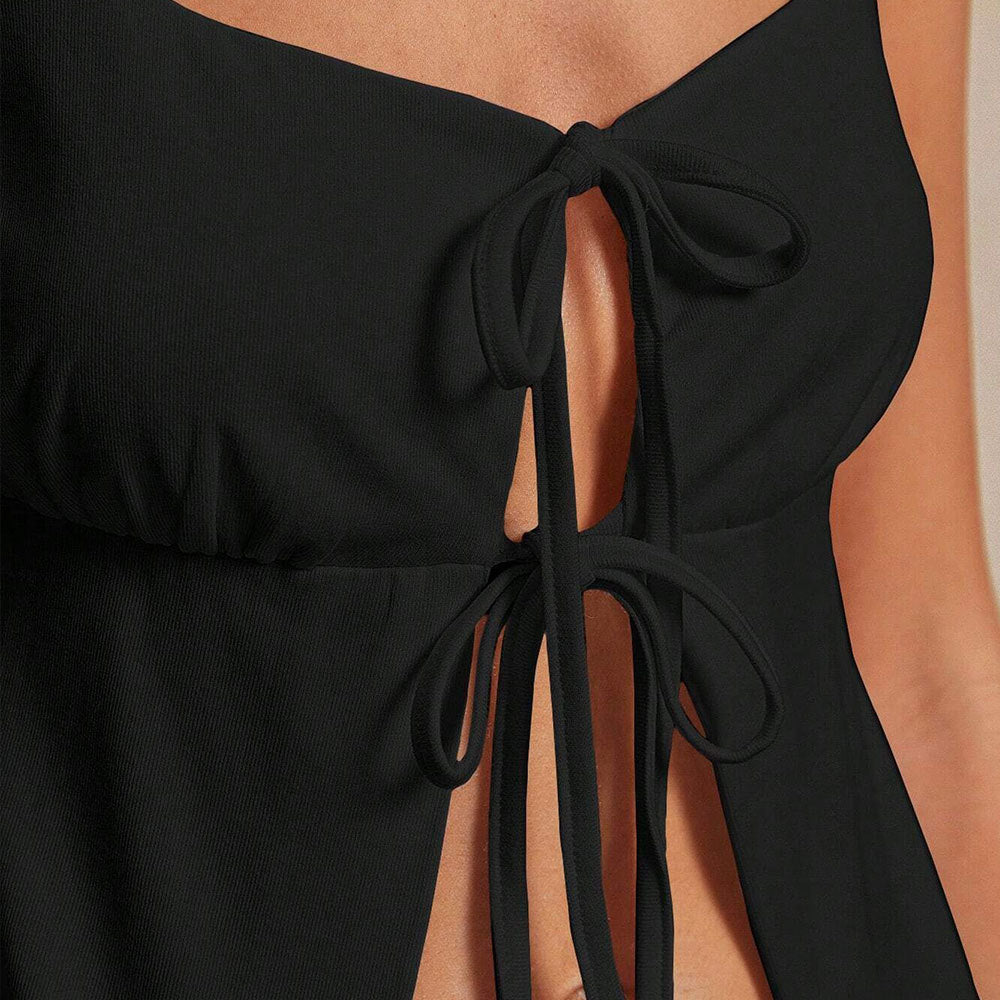 Denna cardigan har en monokrom design som gör den lätt att kombinera med olika plagg. Med sin elastiska passform och knytning fram, erbjuder den både stil och funktionalitet för olika tillfällen.