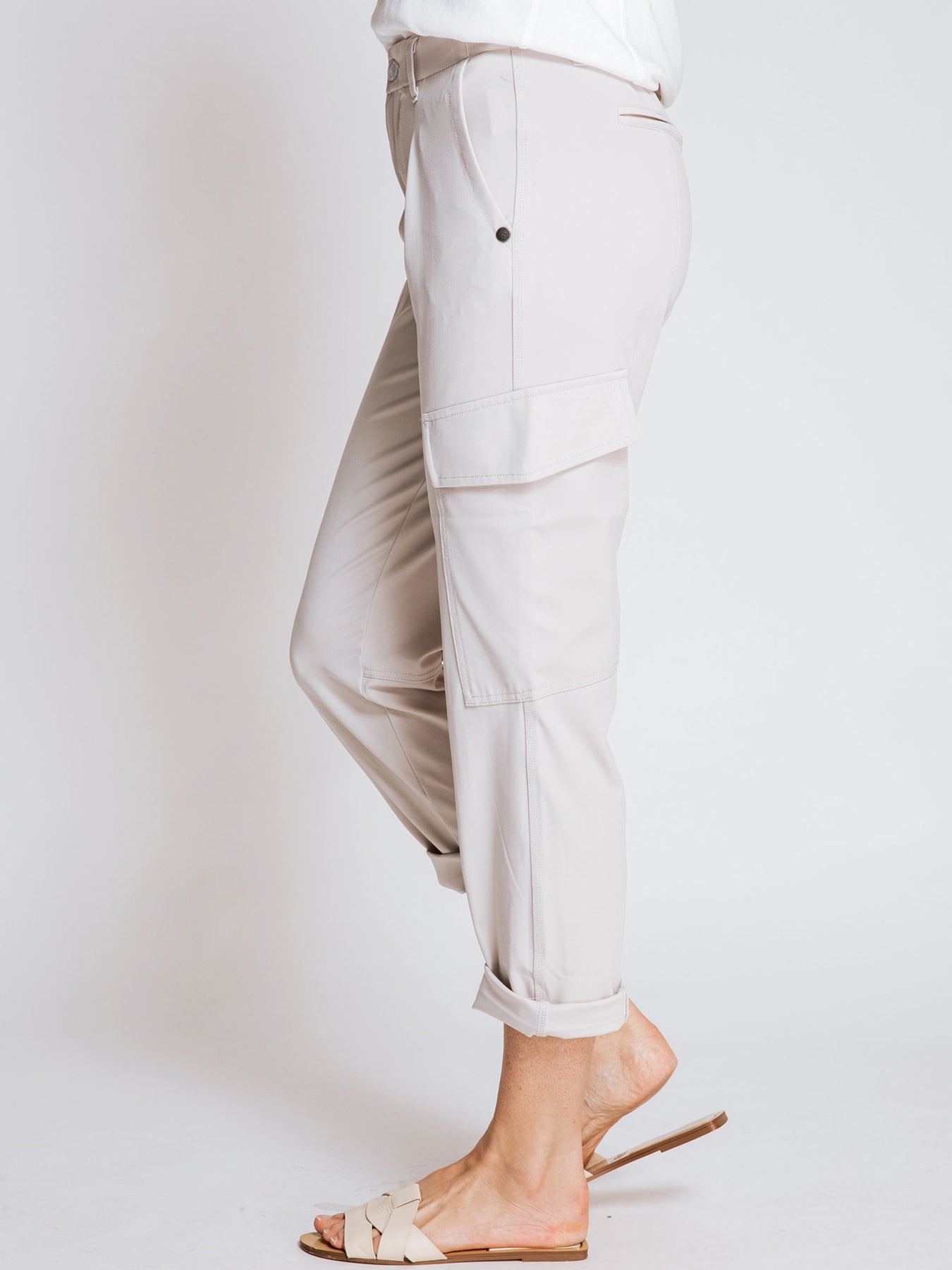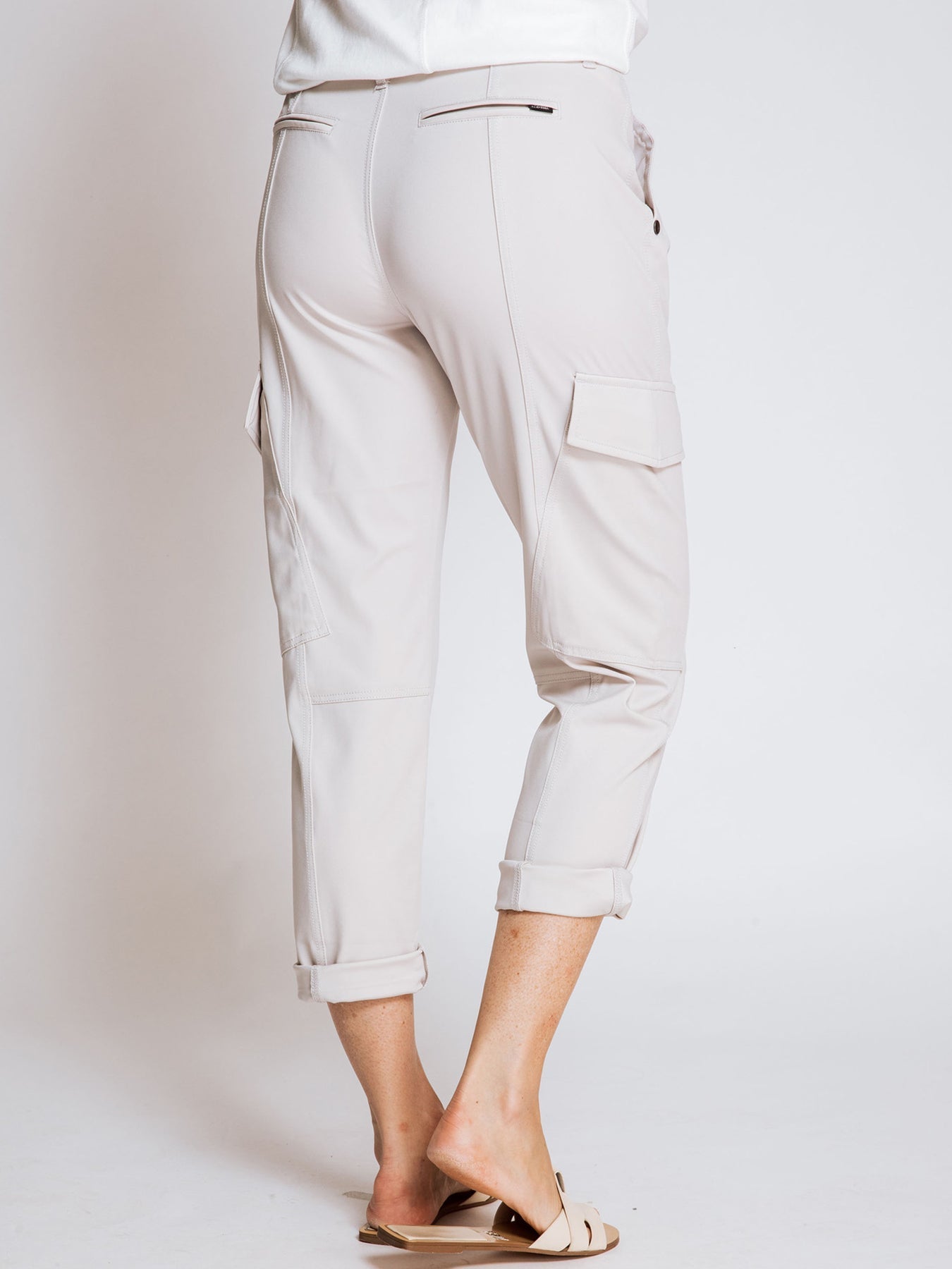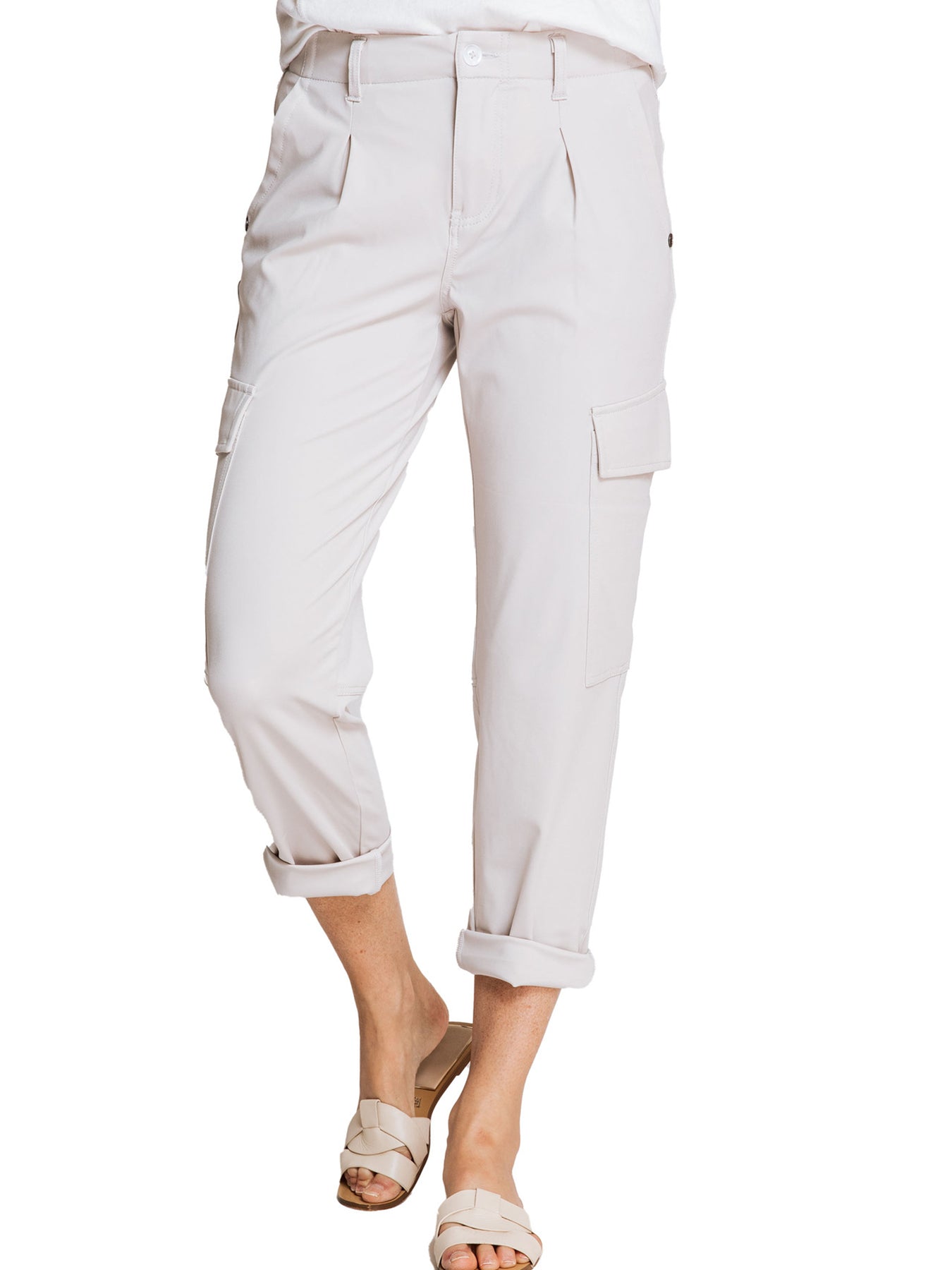 Designen med ankellängd ger en modern känsla, medan de praktiska fickorna tillför funktionalitet. Med en knapp- och blixtlåsstängning får du en säker och bekväm passform som passar perfekt till din garderob.