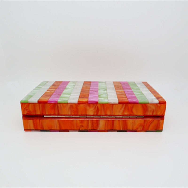 Väskan är tillverkad av högkvalitativ akryl och polyester, vilket gör den både hållbar och elegant. Den randiga designen ger en modern känsla, perfekt för både vardag och fest.