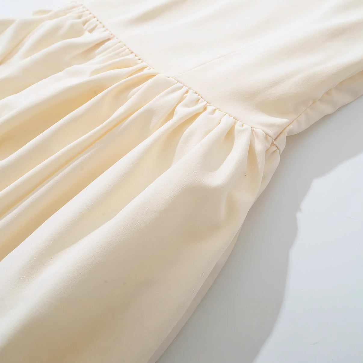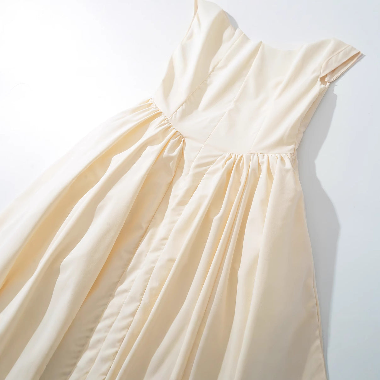 Klänningen har en tidlös design med en bred kjol som svänger vackert vid varje steg. Den klassiska cirkulära halsringningen och de fina detaljerna framhäver din silhuett på ett smickrande sätt, vilket gör den idealisk för cocktailmottagningar, bröllop eller andra festliga evenemang.