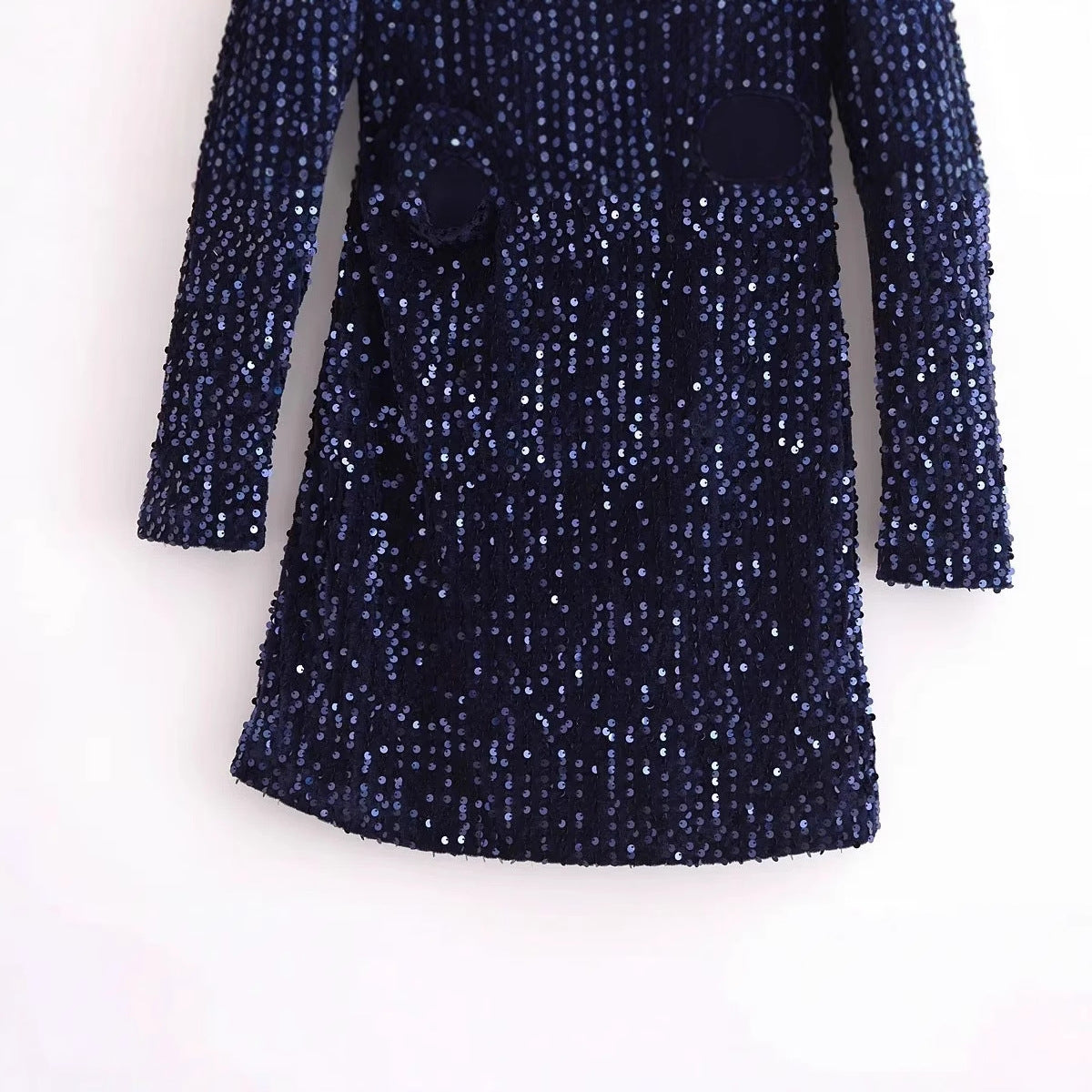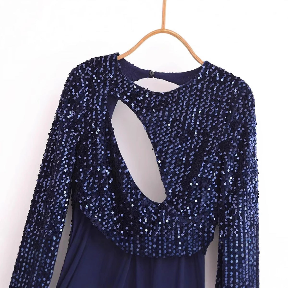 Med sin moderna utskärning och skimrande paljetter erbjuder klänningen en stil som verkligen fångar ögat. De långa ärmarna och den cirkulära halsringningen ger en smickrande silhuett som passar perfekt för olika evenemang.