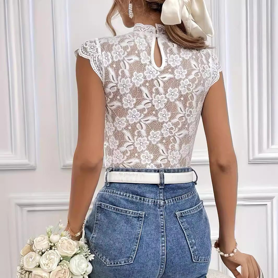 Toppen har en klassisk ståkrage och är tillverkad av ett lätt och luftigt material, vilket gör den idealisk för både vardagliga och festliga tillfällen. Den slimmade passformen framhäver din figur på ett smakfullt sätt.