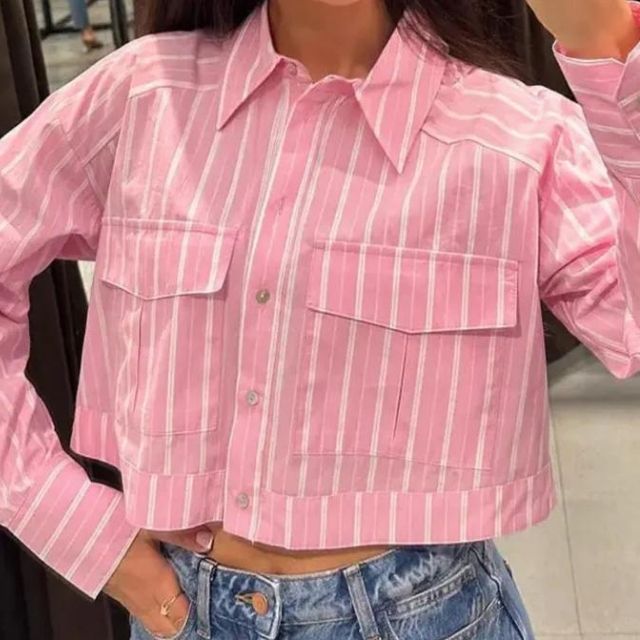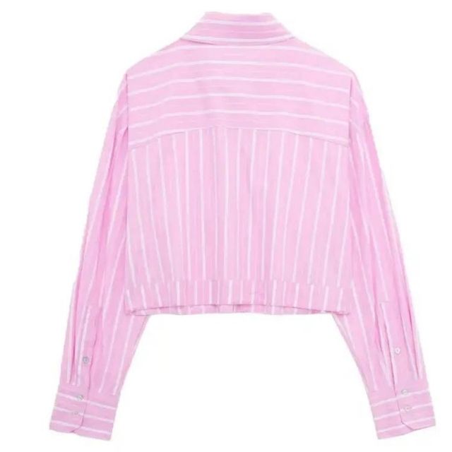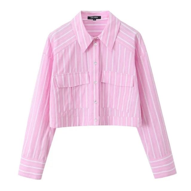 Skjortan har ett mjukt rosa och vitt randigt mönster som ger en fräsch och elegant look. Den lösa passformen och den förkortade designen ger en modern känsla, medan de funktionella bröstfickorna tillför en praktisk touch.