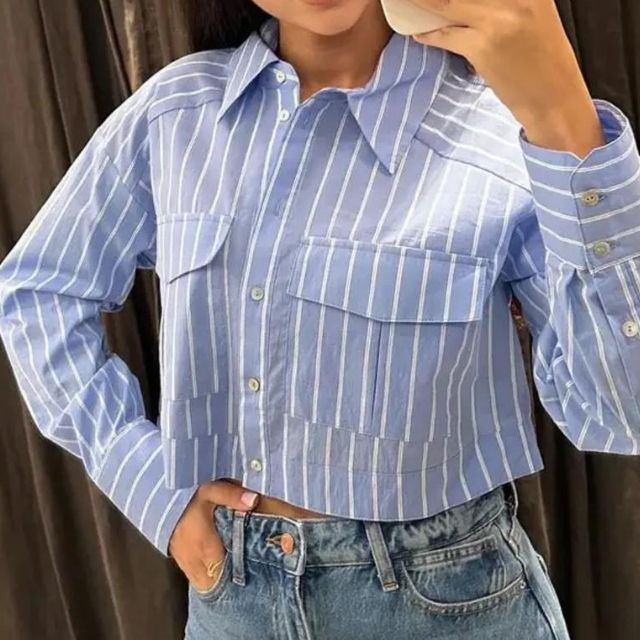Dam Förkortad Skjorta Randig Mjuk Bomull med Bröstfickor