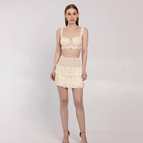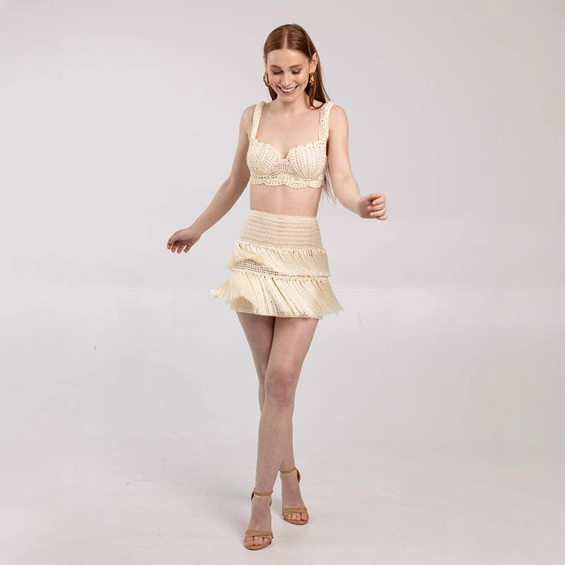 Setet består av en topp med delikata virkmönster och en kjol med fransdetaljer, vilket ger en sofistikerad look. Tillverkat av 100% högkvalitativ bomull, är det både lätt och andningsbart, vilket gör det idealiskt för varma dagar.