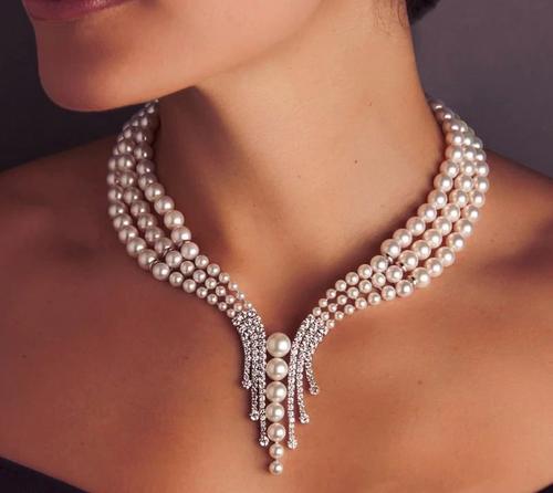 Designen är både modern och tidlös, vilket gör det perfekt för olika tillfällen, från vardagliga händelser till festliga tillställningar. Halsbandet är prytt med reproducerade pärldetaljer som ger en extra dimension av skönhet.
