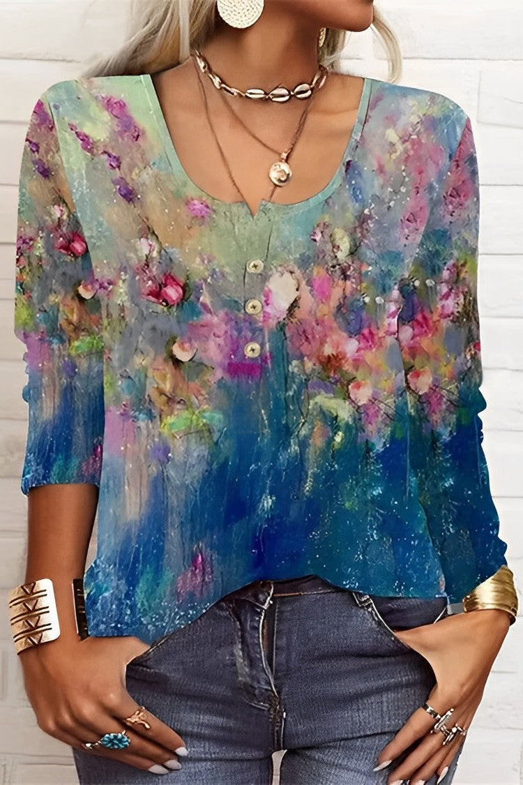 Denna topp har ett vackert blommönster och en klassisk Henley-halsringning som ger en tidlös stil. Med sin lösa passform och långa ärmar är den idealisk för både avslappnade och mer eleganta tillfällen, vilket gör den till ett mångsidigt plagg i din garderob.