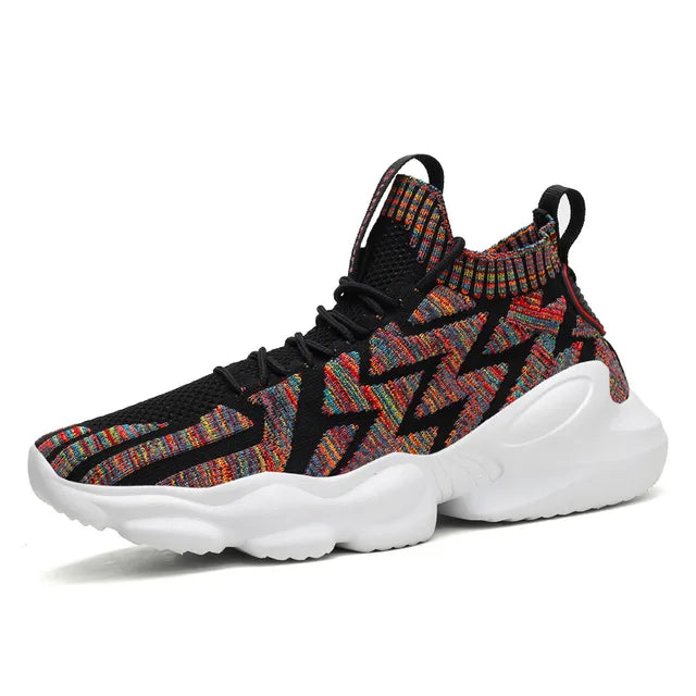 Upplev framtiden med dessa hög top sneakers som kombinerar stil och funktionalitet. Med ett livligt, mångfärgat webbmönster kommer dessa skor att fånga allas uppmärksamhet och ge dig en känsla av komfort hela dagen.