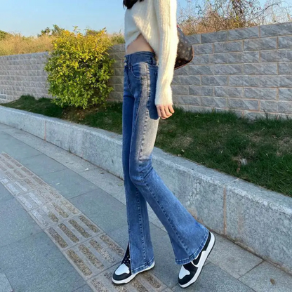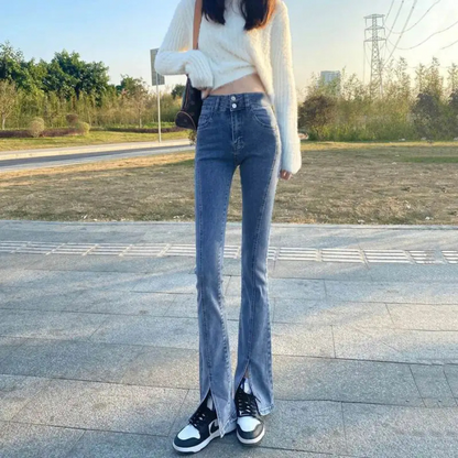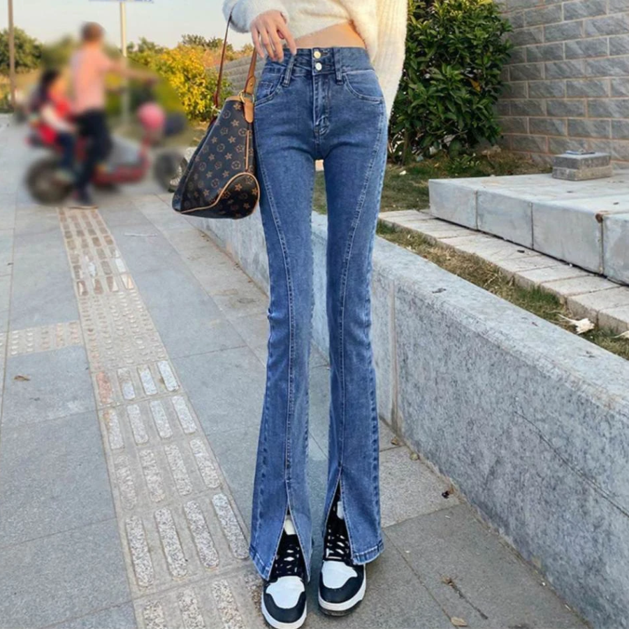 Den klassiska designen med en modern twist gör att dessa jeans passar perfekt för alla tillfällen. Den speciella split-bell halsringningen ger en unik accent till din outfit, vilket gör att du alltid ser trendig ut.