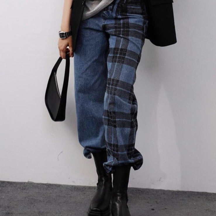 Dam Jeans med Hög Midja Raka i Polyester med Rutig Struktur