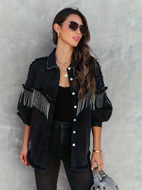 Denna jacka är utformad med vackra fransar som ger en unik touch till din outfit. Den är mångsidig nog att bäras över en klänning eller med jeans och t-shirt, vilket gör den till ett måste i varje modeentusiasts garderob.